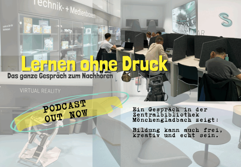 Dieses Mal direkt aus der Zentralbibliothek Mönchengladbach, wo Sofija, Ida, Justus, Emil und Simon mit Dorothée Vollmer und Yilmaz Holtz-Ersahin darüber gesprochen haben, wie Lernen auch ohne Prüfungsdruck funktioniert.