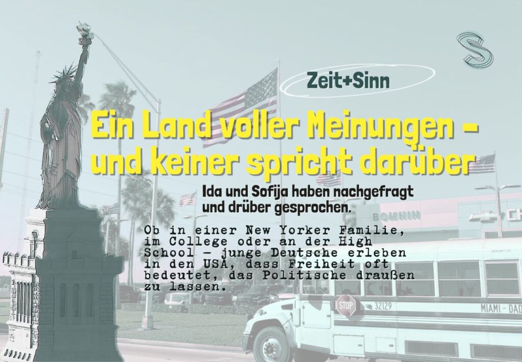 Die Standpunkt-Redakteurinnen Ida und Sofija haben Erfahrungen deutscher Austauschschüler:innen und Au-pairs aus den USA zusammen getragen und dabei erlebt, was der Medienwissenschaftler Bernhard Pörksen als eine Gesellschaft bezeichnet, in der man lieber höflich schweigt als offen diskutiert. Der Bericht zeigt, wie das Schweigen über Politik dort zum Alltag geworden ist und warum das mehr über unsere Gegenwart verrät, als man denkt.