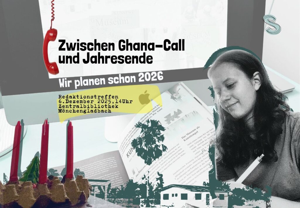 Wenn die Chefredakteurin Charlotte Schmitz, die gerade ihr FSJ in Ghana verbringt mit der Projektkoordinatorin Dorothée Vollmer in MG telefniert. Dann enstehen zwischen Schulprojekten in Ghana, tropischer Hitze und einem ziemlich coolen DIY-Adventskranz (der eigentlich eher wie ein Stück postmoderner Konzeptkunst aussieht) und dem halb-stabilem WLAN und Weihnachtstee in Gladbach aus den vielen Anfragen und Gelegenheiten, die an unsere Redaktion herangetragen werden, neue Ideen für 2026.