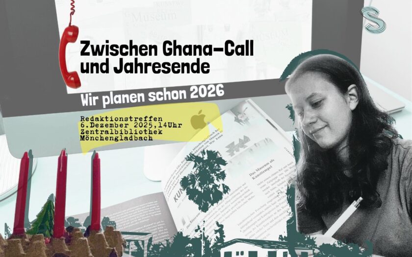 Wenn die Chefredakteurin Charlotte Schmitz, die gerade ihr FSJ in Ghana verbringt mit der Projektkoordinatorin Dorothée Vollmer in MG telefniert. Dann enstehen zwischen Schulprojekten in Ghana, tropischer Hitze und einem ziemlich coolen DIY-Adventskranz (der eigentlich eher wie ein Stück postmoderner Konzeptkunst aussieht) und dem halb-stabilem WLAN und Weihnachtstee in Gladbach aus den vielen Anfragen und Gelegenheiten, die an unsere Redaktion herangetragen werden, neue Ideen für 2026.