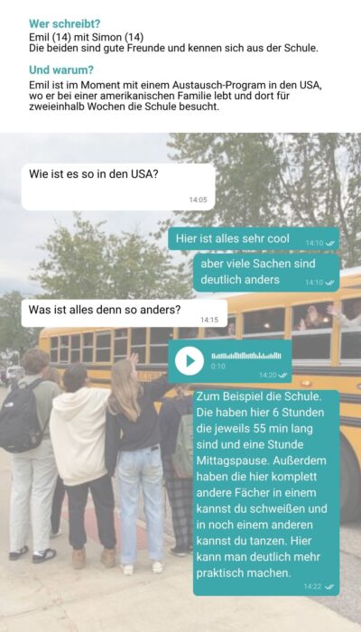 Auch Emil, 14 Jahre und Austauschschüler in Michigan, kommt mit politischen Themen nicht in Berührung. Er erlebt viele Unterschiede und schreibt darüber mit seinem Freund: