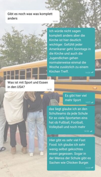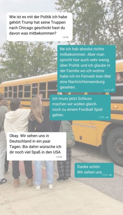 „Man spricht hier sehr wenig über Politik und in meiner Austauschfamilie habe ich kein einziges Mal eine Nachrichtensendung gesehen“, schreibt er. „noch nicht einmal vom Nationalgarde-Einsatz in Chicago habe ich etwas mitbekommen.“