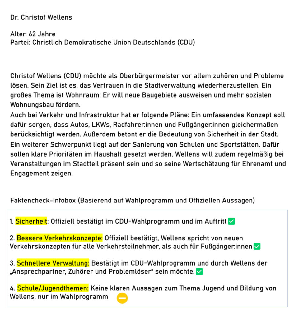 Unterm Strich hinterließen die Kandidat*innen sehr unterschiedliche Eindrücke: FDP-Kandidat Gutowski wirkte etwas reserviert, setzte aber liberale Akzente, etwa beim differenzierten Blick auf Handys. Heinrichs von der SPD trat souverän, präsent und lösungsorientiert auf – vor allem beim Thema Digitalisierung. CDU-Kandidat Wellens wirkte zurückhaltend, reagierte aber scharf auf Kritik. Linken-Kandidat Merkens kam sachlich, gut vorbereitet und jugendnah rüber. Grünen-Kandidat Klotz punktete mit Klimaschutz und Radwegen, ließ aber durchblicken, dass er viel Eigeninitiative von jungen Menschen erwartet.