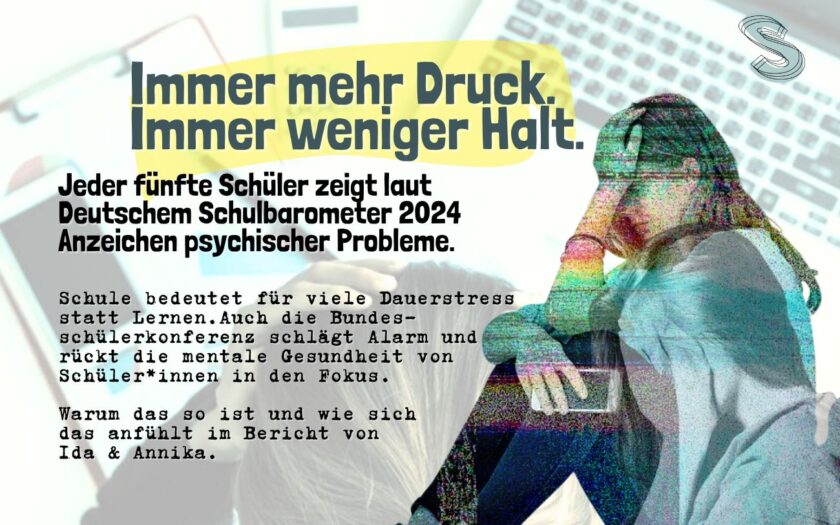 „Jede*r Fünfte ist betroffen.“ Diese Zahl macht gerade viele Schüler:innenvertretungen und Expert:innen alarmiert. Laut dem Deutschen Schulbarometer 2024 zeigt rund ein Fünftel der Schüler*innen zwischen acht und 17 Jahren Hinweise auf psychische Auffälligkeiten. Genau darüber wurde kürzlich auch im Politikum Podcast auf WDR 5 gesprochen. Die mentale Gesundheit junger Menschen ist nicht nur ein privates Problem, sondern betrifft Schule, Gesellschaft und sogar die Wirtschaft. Auch die Bundesschülerkonferenz greift das Thema auf. Auf ihrer Presse- und Bildungskonferenz steht die psychische Gesundheit von Schüler*innen im Mittelpunkt. Der Grund ist, dass sich Viele junge Menschen dauerhaft überfordert, gestresst oder allein gelassen fühlen. Schule wird dabei immer häufiger als Ort erlebt, der Druck verstärkt, statt aufzufangen. Warum das so ist, wie sich dieser Druck im Alltag anfühlt und wie sich das in echten Lebensgeschichten zeigt, beschreibt der folgende Bericht von Ida und Annika.