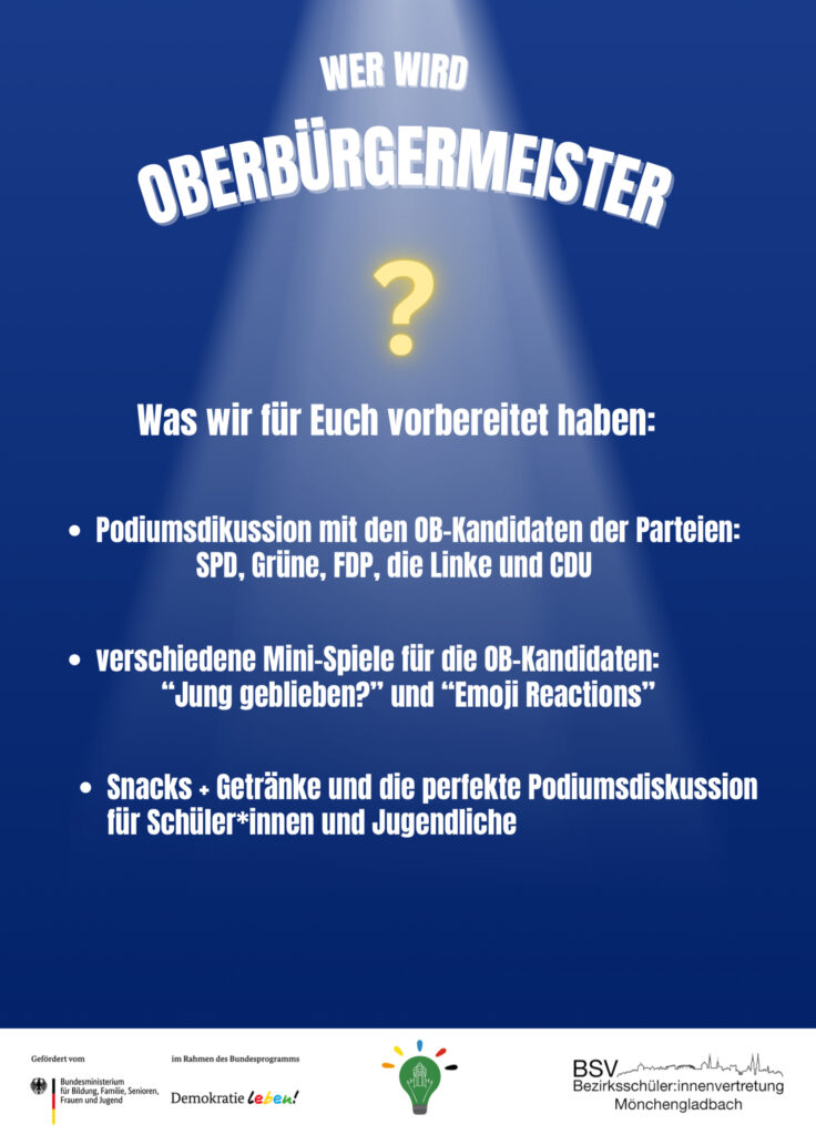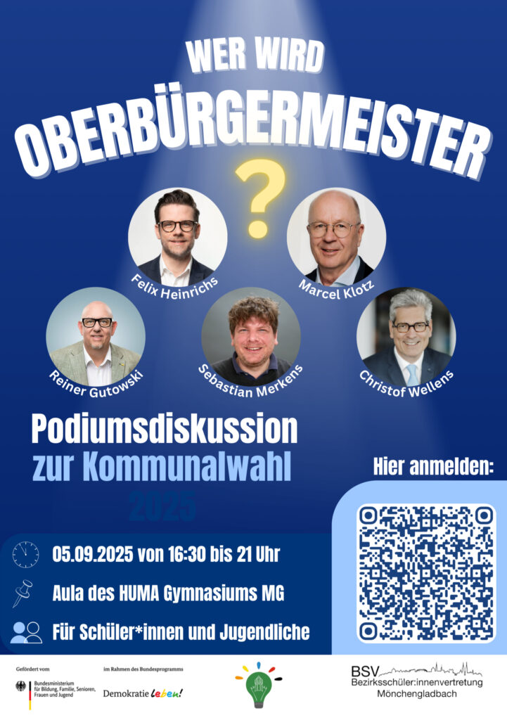 Um Jugendlichen die Chance zu geben, sich ein eigenes Bild zu machen, lädt die Bezirksschülervertretung Mönchengladbach am 5. September von 16.30 – 21 Uhr ins HUMA Gymnasium MG ein. Dort stellen sich die Oberbürgermeisterkandidaten von SPD, Grünen, FDP, Linken und CDU den Fragen der jungen Generation. Neben einer klassischen Podiumsdiskussion wird es auch spielerische Formate geben – etwa „Jung geblieben?“ und „Emoji Reactions“. Snacks und Getränke sorgen für die entspannte Atmosphäre, die es braucht, damit Schülerinnen offen nachhaken und ins Gespräch kommen können.