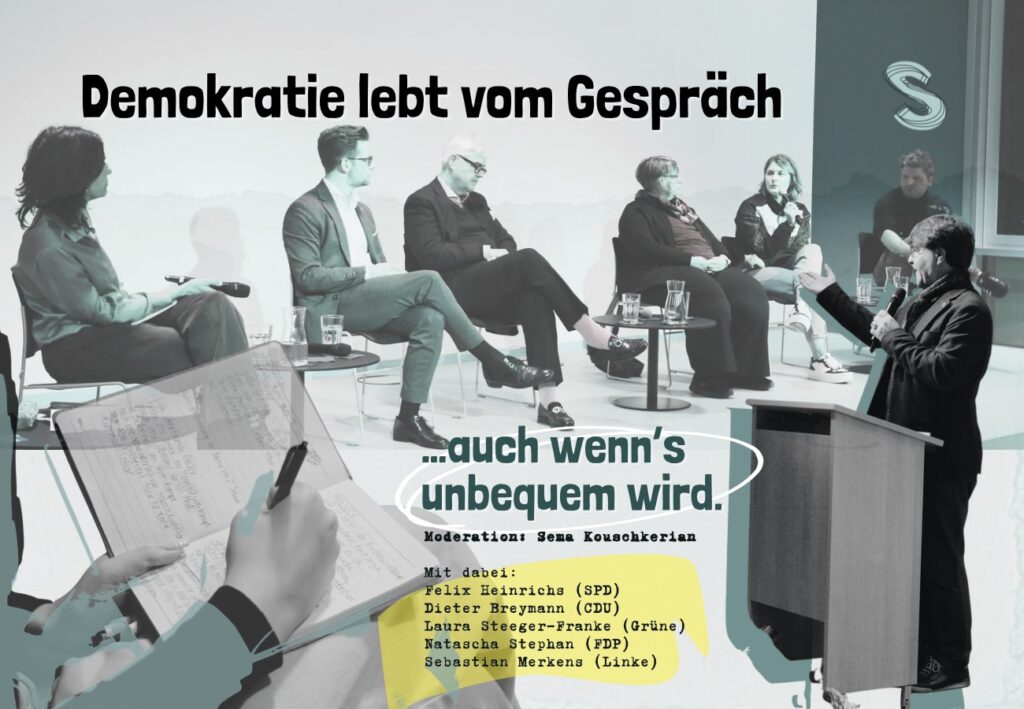 Fünf Kommunalpolitiker:innen – Oberbürgermeister Felix Heinrichs (SPD), Dieter Breymann (CDU), Laura Steeger-Franke (Grüne), Natascha Stephan (FDP) und Sebastian Merkens (Linke) – sprachen mit Moderatorin Sema Kouschkerian darüber, wie Demokratie in schwierigen Zeiten bestehen kann.