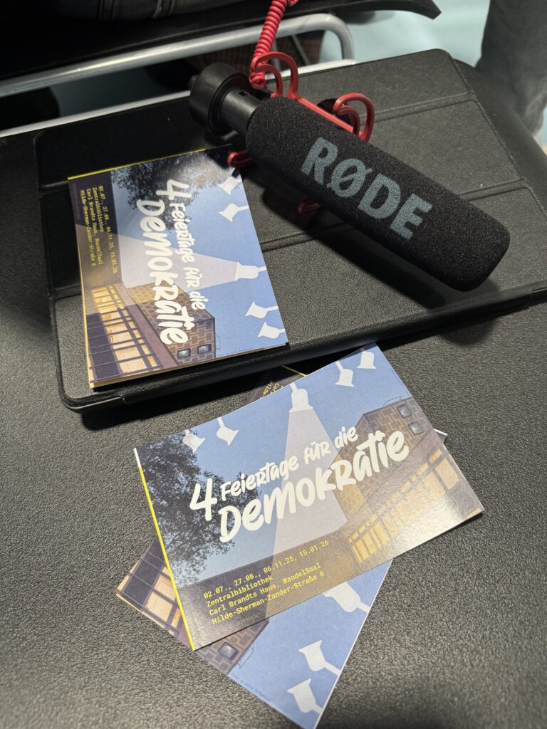 Das Publikum hörte aufmerksam zu. Viele nickten, als Sebastian Merkens sagte: „Man müsse sich bewusst machen, dass Demokratie nicht im Netz stattfindet, sondern in Begegnungen, in Gesprächen, in Bibliotheken wie dieser.“