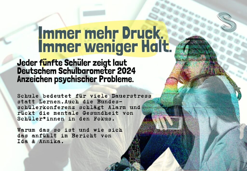 „Jede*r Fünfte ist betroffen.“ Diese Zahl macht gerade viele Schüler:innenvertretungen und Expert:innen alarmiert. Laut dem Deutschen Schulbarometer 2024 zeigt rund ein Fünftel der Schüler*innen zwischen acht und 17 Jahren Hinweise auf psychische Auffälligkeiten. Auch die Bundesschülerkonferenz greift das Thema auf. Auf ihrer Presse- und Bildungskonferenz steht die psychische Gesundheit von Schüler*innen im Mittelpunkt. Der Grund ist, dass sich Viele junge Menschen dauerhaft überfordert, gestresst oder allein gelassen fühlen. Schule wird dabei immer häufiger als Ort erlebt, der Druck verstärkt, statt aufzufangen. Warum das so ist, wie sich dieser Druck im Alltag anfühlt und wie sich das in echten Lebensgeschichten zeigt, beschreibt der folgende Bericht von Ida und Annika.